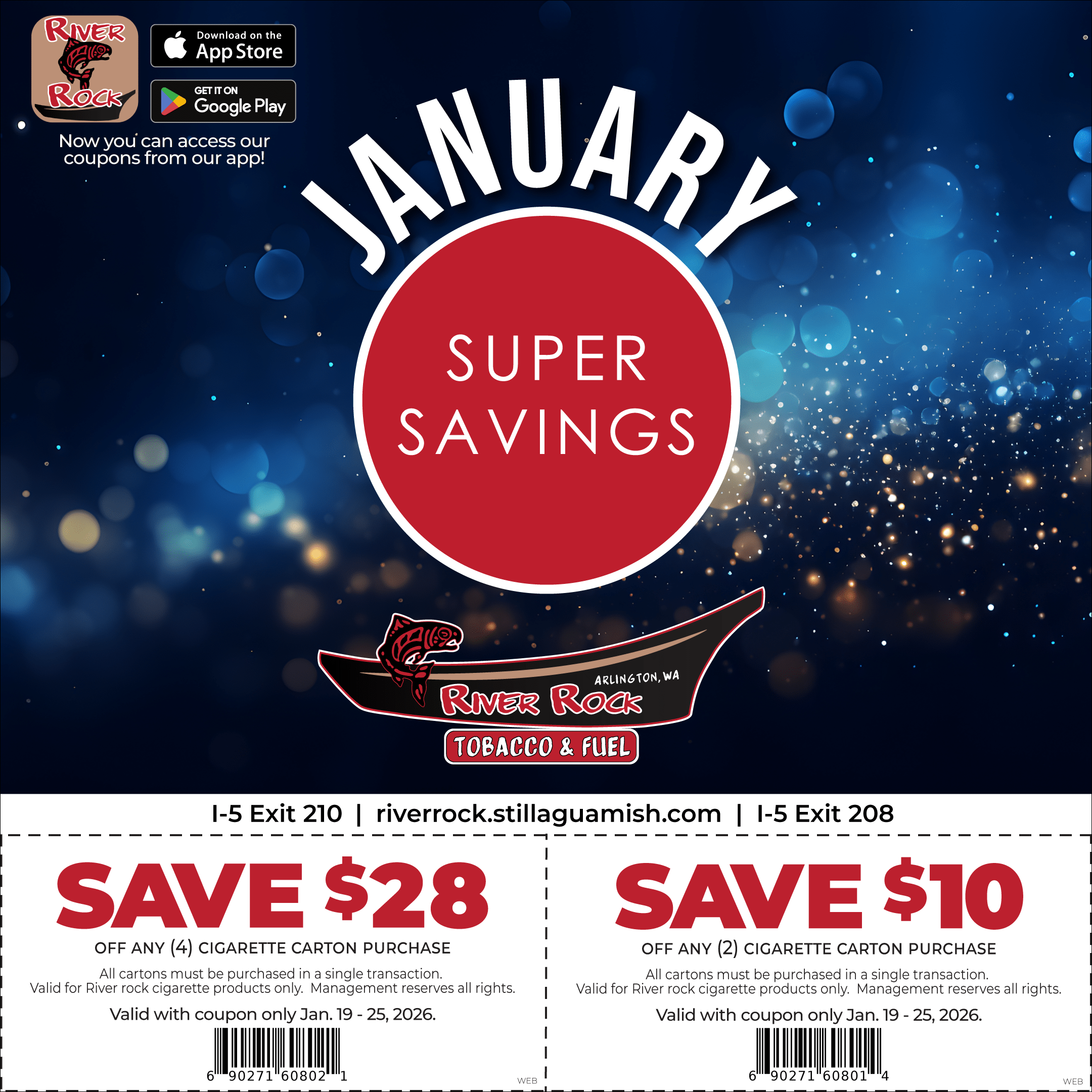 Save $28 off any four (4) cigarette carton purchases. All cartons must be purchased in a single transaction. Valid for River Rock cigarette products only. Management reserves all rights. Refer to the coupon for expiration dates.